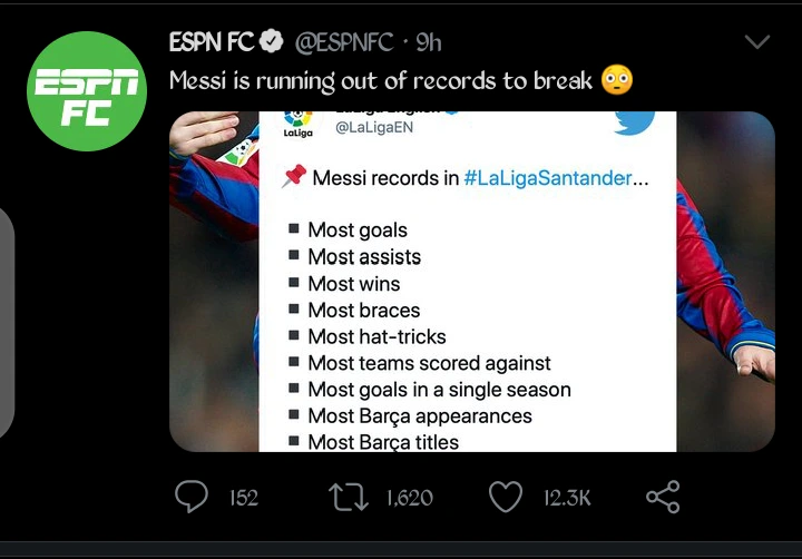 He has broken almost every records in Spanish La Liga and he is running out of record. These are the records he has broken, he has the most goals, most assist, most mlwins, most brace, more hat tricks, most teams scored adainst, most goals in a single season, most barca appearance, most barca titles and many more. This was share by ESPN on thier twitter handle.